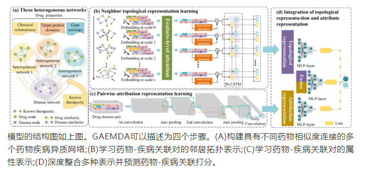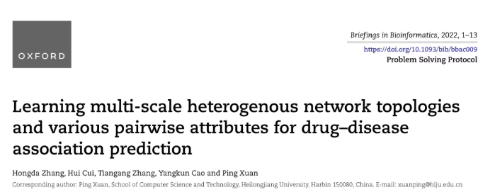 今天给大家介绍一篇来自黑龙江大学的玄萍教授团队在2022年发表在《Briefings in Bioinformatics》上的一篇文章《Learning multi-scale heterogenous network topologies and various pairwise attributes for drug-disease association prediction》。本文提出了一种基于多尺度异构网络拓扑信息和多种相关属性的药物-疾病关联预测方法。