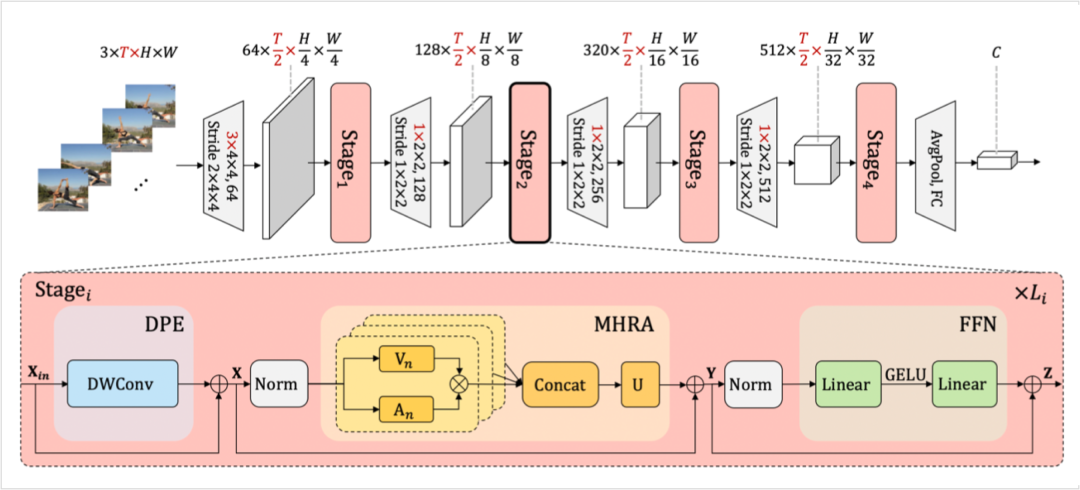 模型整体框架如上图所示,借鉴了 CNN 的层次化设计,每层包含多个 Transformer 风格的 UniFormer block。每个 UniFormer block 主要由三部分组成,动态位置编码 DPE、多头关系聚合器 MHRA 及 Transformer 必备的前馈层 FFN。