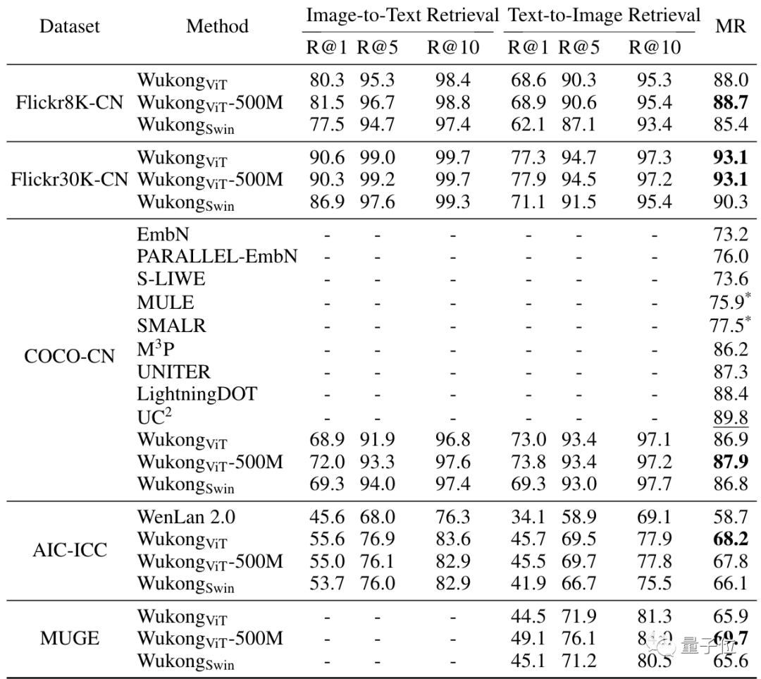 而这也证明了将在英语数据集上预训练的图像编码器应用于中文多模态预训练的良好效果。未来也可能会探索更多的解决方案,利用悟空数据集训练多语言跨模态模型。