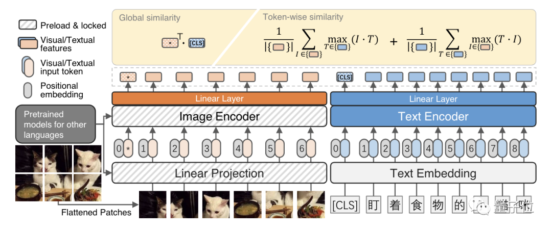有意思的一点是,这里的图像编码器是从英文数据集上训练的,上面预加载并锁定了从外部模型中训练的英文数据集中的权重。