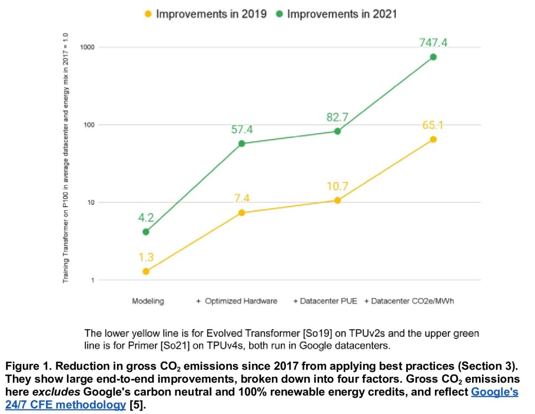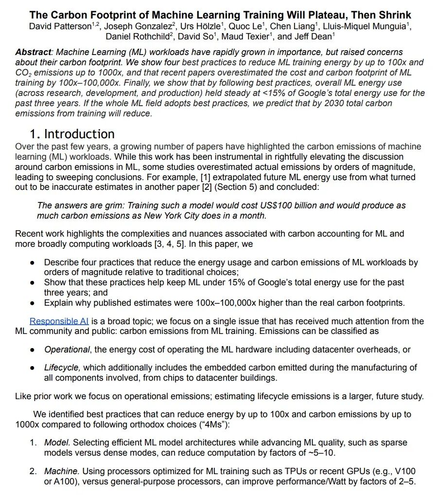 机器学习训练碳排放将趋于平稳并逐步缩减。机器学习(ML)工作负载的重要性迅速增加,但引起了人们对其碳排放的关注。本文展示了四种最佳实践,即4M(model, machine, mechanization, map),可以将机器学习训练的能源减少100倍,二氧化碳排放减少1000倍,最近的论文将机器学习训练的成本和碳排放高估了100倍-100,000倍。通过遵循最佳实践,在过去三年里,整体的机器学习能源使用(包括研究、开发和生产)稳定在Google总能源使用的15%以下。如果整个机器学习领域都采用最佳实践,预测到2030年,训练的总碳排放量将有所减少。