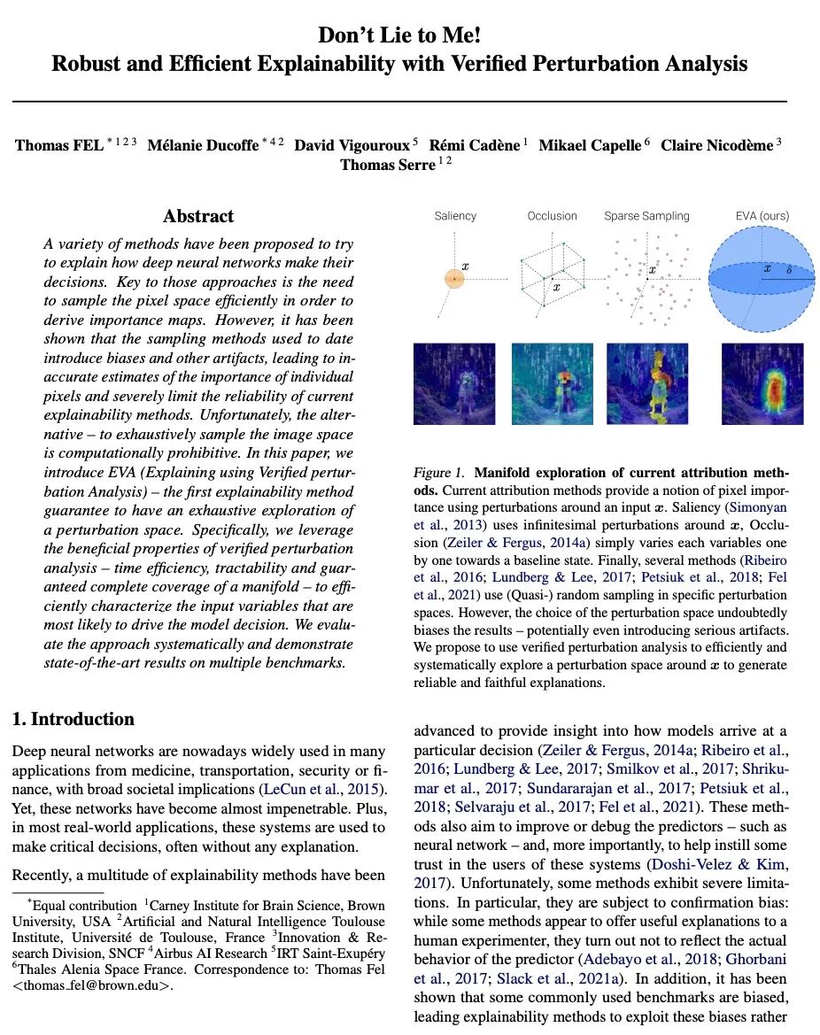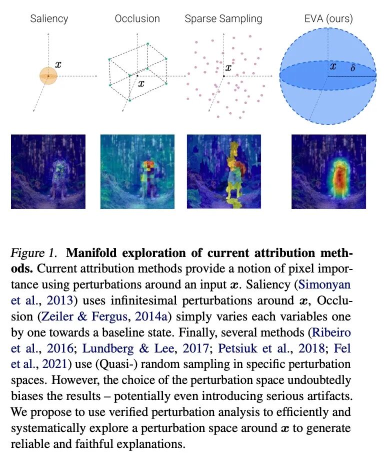 基于验证性扰动分析的鲁棒高效可解释性。人们提出了各种方法,试图解释深度神经网络是如何做出决策的。这些方法的关键,是需要对像素空间进行有效的采样,以得出重要性图。然而,事实证明,到目前为止使用的采样方法引入了偏差和其他伪影,导致对单像素重要性的不准确估计,严重限制了当前可解释性方法的可靠性。不幸的是,另一种方法——对图像空间进行详尽的采样,在计算上是很困难的。本文提出EVA(基于验证性扰动分析进行解释)——第一种保证对扰动空间进行详尽探索的可解释性方法。利用验证性扰动分析的有利特性——时间效率、可操作性和保证对流形的完全覆盖——来有效描述最有可能驱动模型决策的输入变量。对所提出方法进行了系统的评估,并在多个基准上展示了最先进的结果。