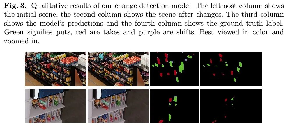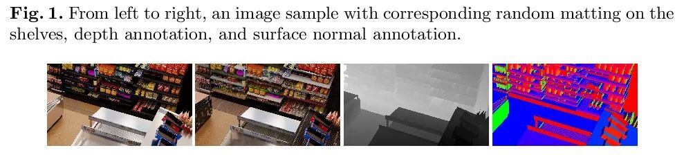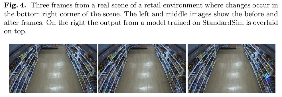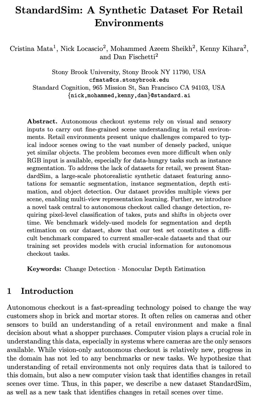 StandardSim:零售环境合成数据集。自主结账系统依靠视觉和感官输入,在零售环境中进行精细的场景理解。与典型室内场景相比,零售环境具有独特的挑战,因为它有大量密集的、独特而相似的物体。当只有RGB输入时,该问题变得更加困难,特别是对数据要求高的任务,如实例分割。为解决零售业缺乏数据集的问题,本文提出StandardSim,一个大规模的逼真合成数据集,具有语义分割、实例分割、深度估计和目标检测的标注。该数据集为每个场景提供了多个视图,实现了多视图表示学习。引入了一项对自主检查至关重要的新任务,即变化检测,需要对物体随时间变化的取、放和移动进行像素级分类。在该数据集上对广泛使用的分割和深度估计模型进行了基准测试,表明该测试集与目前较小规模的数据集相比构成了一个困难的基准,为模型提供了自主结账任务的关键信息。