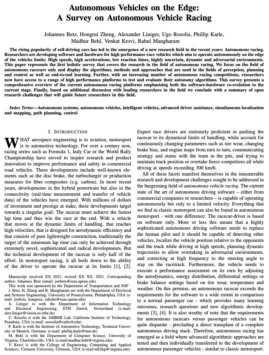 J Betz, H Zheng, A Liniger, U Rosolia, P Karle, M Behl, V Krovi, R Mangharam
