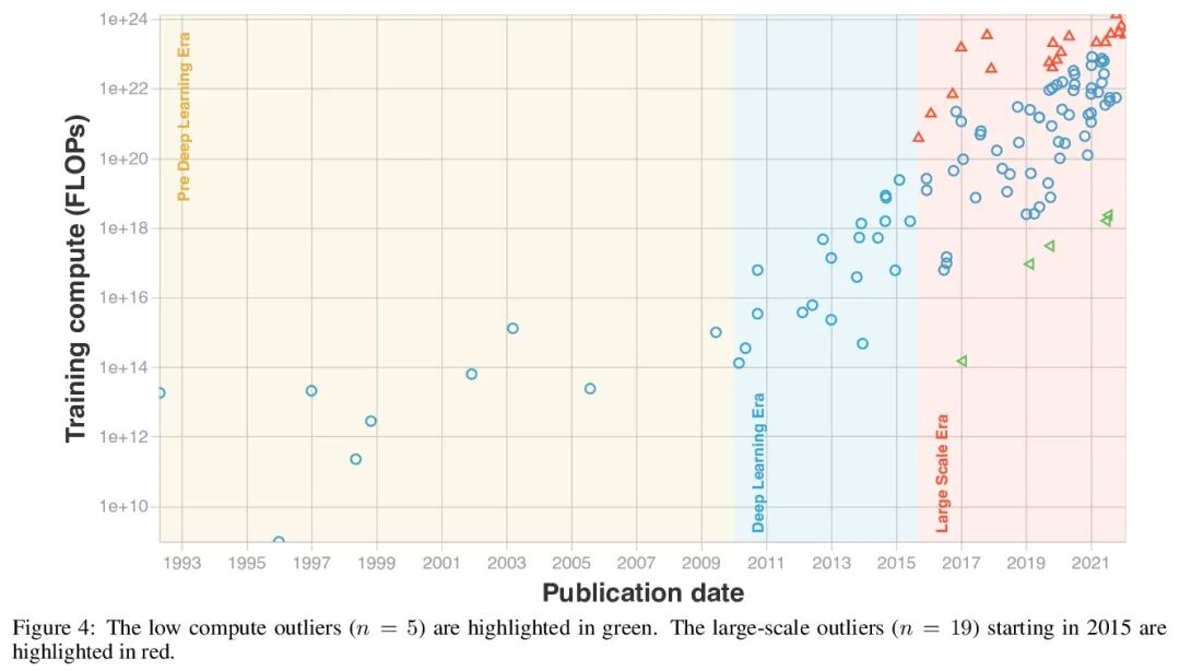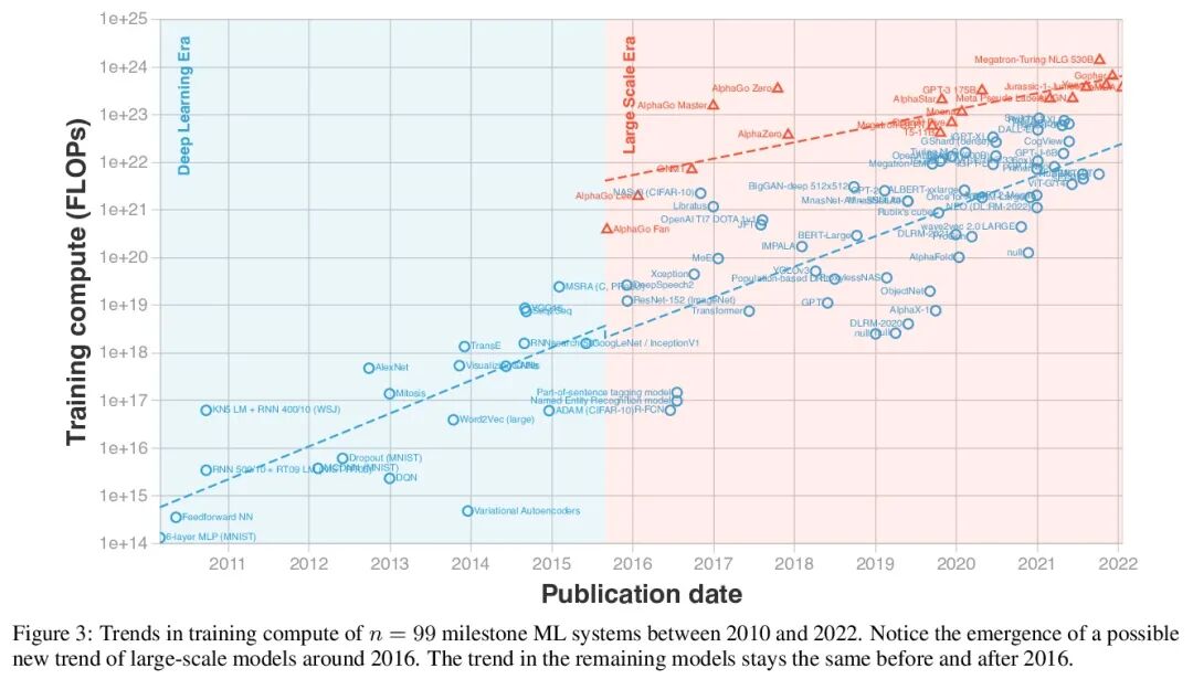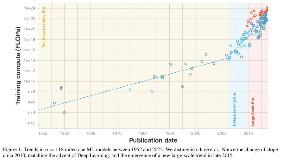 机器学习三个时代的计算趋势。计算、数据和算法的进步,是指导现代机器学习(ML)进展的三个基本因素。本文研究了最容易量化的因素——计算——的趋势,通过100多个里程碑式的机器学习系统的训练计算量数据集,来研究计算量的趋势,并利用这些数据分析这一趋势是如何随时间增长的。在2010年之前,训练计算量的增长与摩尔定律相一致,大约每20个月翻一番。自从2010年代初深度学习出现以来,训练计算的扩展速度加快,大约每6个月翻一番。2015年末,随着企业开发出大规模的机器学习模型,例如AlphaGo,对训练计算的要求提高了10到100倍,出现了一个新的趋势。基于这些观察,将机器学习的计算史划分为三个时代:前深度学习时代、深度学习时代和大规模时代。用这三个时代来表示计算量的发展趋势,有助于解释在数据中观察到的不连续现象。本文工作强调了训练高级机器学习系统的快速增长的计算需求。