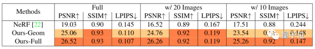 作者们还尝试将照片数量减少到20张甚至10张,对NeRF和NeROIC进行训练。