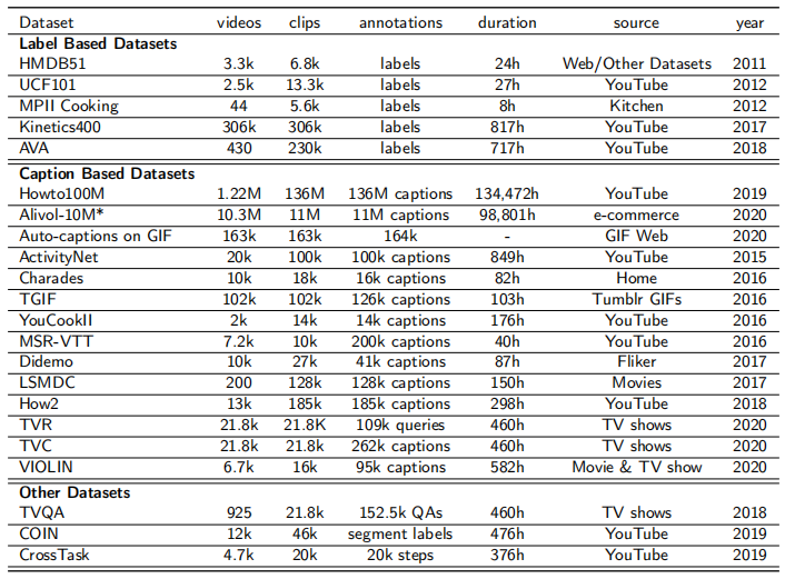 与 CNN 相比,基于 Transformer 的架构严重依赖于大规模收集(尤其是对预训练而言)。视频数据集的质量和数量与模型性能息息相关。如图 4 所示,常用的视频数据集可分为:(1)基于标签的数据集(2)基于文本描述的数据集(3)其它数据集。