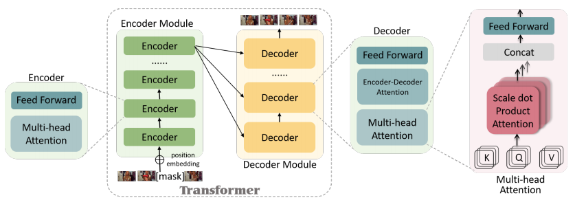 在原始 Transformer 的基础之上,研究者们提出了各种变体来解决跨模态编码和时空编码问题。对于跨模态编码,研究者们通常将不同的模态用作跨模态交互的 Query 和 Key。ViLBERT 提出了一种联合注意力 Transformer 架构,通过交换多头注意力中的 key-value 对来构建跨模态交互。ActBERT 和 MulT 将跨模态注意力扩展到了 3 种模态的交互。就时空编码而言,由于视频同时由时间和空间维度构成,作者本质上使用 Transformer 处理单个信息序列。