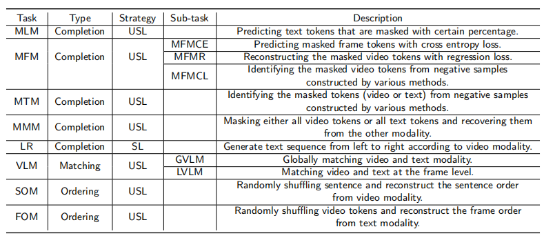 图 3:「视频-语言」预训练中的常用代理任务一览