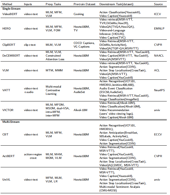 本文首先简要介绍了 Transformer 的相关背景知识(包括注意力机制、位置编码等)。本文从代理任务、下游任务和常用视频数据集三个方面介绍了典型的「视频-语言」处理的「预训练-微调」范式。接下来,本文将 Transformer 模型分为单流和多流结构,重点介绍了它们的创新之处,并比较了它们的性能。最后,本文分析、讨论了「视频-语言」预训练目前面临的挑战和未来可能的研究方向。