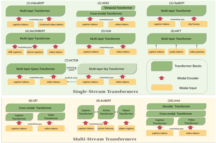 图 5:用于「视频-语言」表征学习的 Transformer 模型一览。