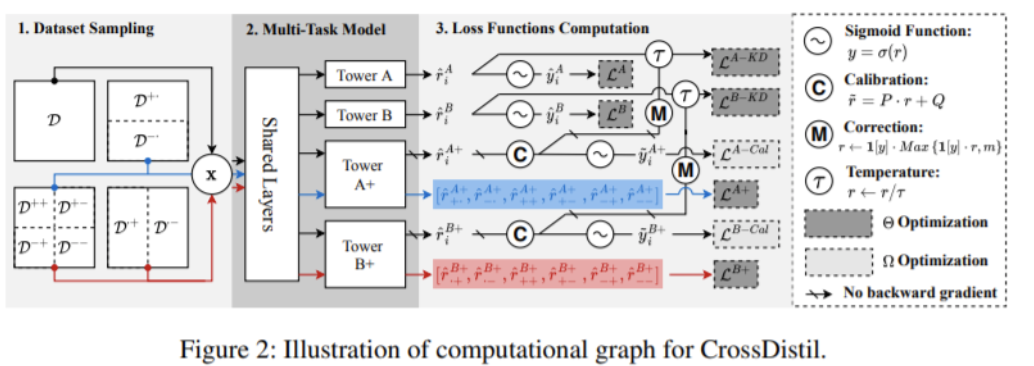 多任务学习已广泛应用于现实世界的推荐者,以预测不同类型的用户反馈。之前的大多数工作都集中在为底层设计网络架构,作为一种共享输入特征表示知识的手段。然而,由于它们采用特定于任务的二进制标签作为训练的监督信号,关于如何准确地对物品进行排序的知识并没有在任务之间完全共享。本文旨在增强多任务个性化推荐优化目标的知识迁移。我们提出了一个跨任务知识蒸馏(Cross-Task Knowledge精馏)的推荐框架,该框架由三个步骤组成。1) 任务增强: 引入具有四元损失函数的辅助任务来捕获跨任务的细粒度排序信息,通过保留跨任务一致性知识来避免任务冲突; 2) 知识蒸馏: 我们设计了一种基于增强任务的知识蒸馏方法来共享排序知识,其中任务预测与校准过程相结合; 3) 模型训练: 对教师和学生模型进行端到端训练,采用新颖的纠错机制,加快模型训练速度,提高知识质量。在公共数据集和我们的生产数据集上进行了综合实验,验证了CrossDistil的有效性和关键组件的必要性。