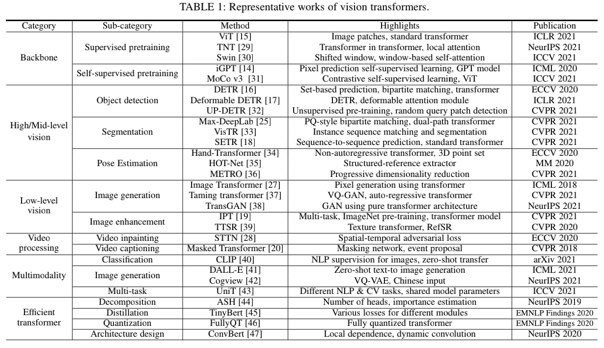 本文对视觉 Transformer 模型进行了系统性的归类,如表 1 所示:骨干网络、高 / 中层视觉、底层视觉、多模态等,并且在每一章中针对任务特点进行详细分析和对比;