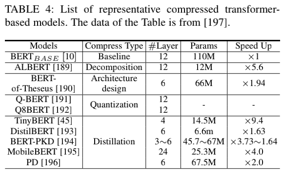 尽管 Transformer 模型在各种任务中取得了成功,但它们对内存和计算资源的高要求阻碍了它们在端侧设备(如手机)上的部署。文章还回顾了为高效部署而对 Transformer 模型进行压缩和加速的研究,这包括网络剪枝、低秩分解、知识蒸馏、网络量化和紧凑结构设计。表 4 列出了一些压缩 Transformer 模型的代表性工作,这些工作采用不同的方法来识别 Transformer 模型中的冗余。