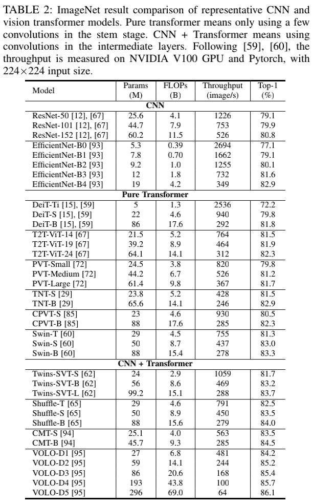 表2 代表性 CNN 和 Transformer 网络在 ImageNet 结果的对比。