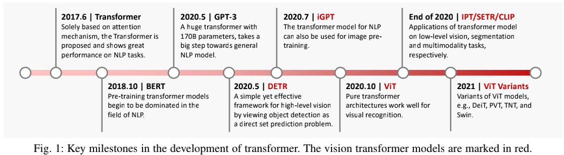 2021年之前,卷积神经网络CNN主宰了计算机视觉领域内的诸多主要模型结构,关于它的研究也呈现出多样化的趋势。然而,2021年Vision Transformer的提出异军突起,逐渐展露出全面取代CNN的发展潜力。以谷歌提出的ViT框架为例,Vision Transformer首先将图像进行分割,接着图像块作为一个序列,从而使用纯Transformer模型进行建模以完成图像分类任务,在多个公共数据集上取得了优越的性能。除图像分类之外,目标检测、语义分割、图像处理等多个任务的SOTA性能同样被Vision Transformer模型不断刷新。根据它们的提出时间,本文作者首先整理出如下发展里程碑: