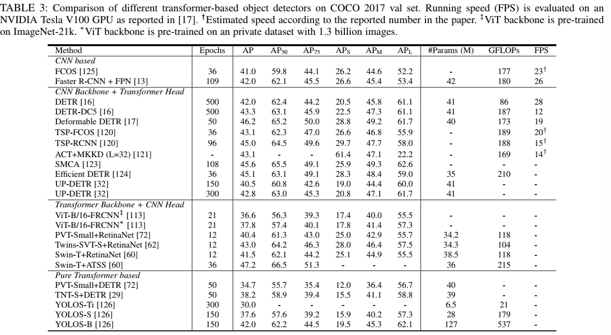 基于 Transformer 的目标检测方法也引起了广泛的兴趣,这些方法大致可以分为两类:基于 Transformer 的检测集合预测方法和基于 Transformer 骨干网络的检测方法。与基于 CNN 的检测器相比,基于 Transformer 的方法在准确性和运行速度方面都表现出了强大的性能。表 3 展示了在 COCO 数据集上基于 Transformer 的不同目标检测器的性能。