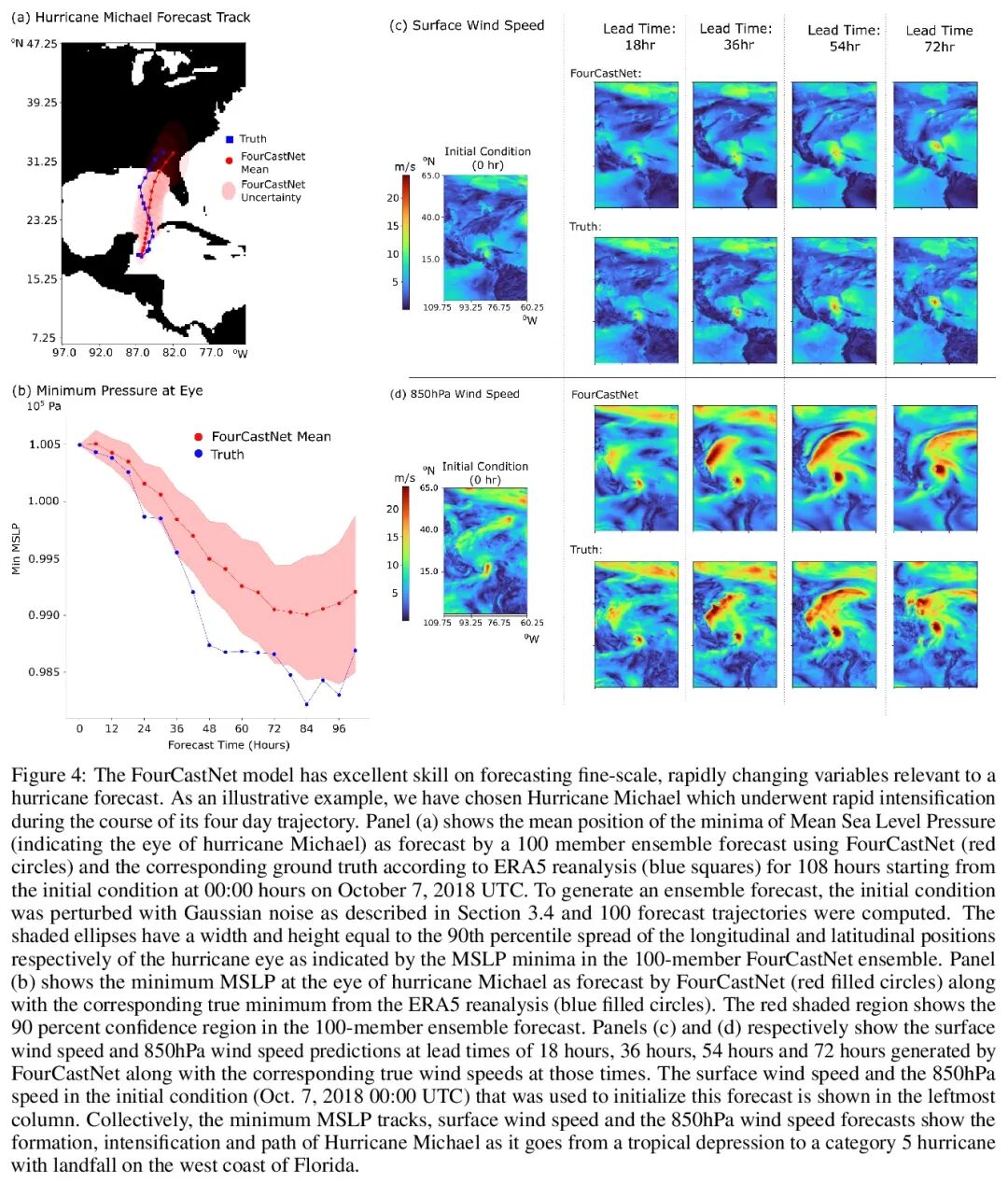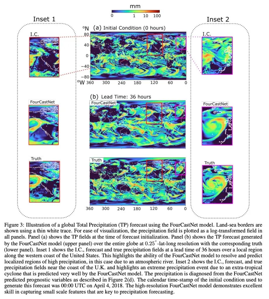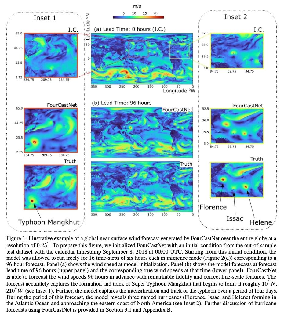 FourCastNet: 基于自适应傅里叶神经算子的数据驱动全球高分辨率气象模型。FourCastNet即傅里叶预测神经网络,是一个数据驱动全球天气预报模型,能以0.25◦的分辨率提供准确的短至中期全球预测结果。FourCastNet准确预测了高分辨率、快速时间尺度的变量,如地表风速、降水和大气水汽。它对规划风能资源、预测极端天气事件(如热带气旋、热带外气旋和大气层河流)有重要意义。FourCastNet与ECMWF综合预报系统(IFS)的预报精度相匹配,IFS是最先进的数值天气预报(NWP)模型,在大尺度变量方面的预报时间很短,而在小尺度变量(包括降水)方面则超过了IFS。FourCastNet在不到2秒的时间内生成一个为期一周的预报,比IFS快了几个数量级。FourCastNet的速度使其能快速、廉价地创建具有数千名集合成分的大型集成预报,以改善概率预报。本文讨论了像FourCastNet这样的数据驱动的深度学习模型是如何成为气象学工具箱的宝贵补充,以帮助和增强NWP模型。