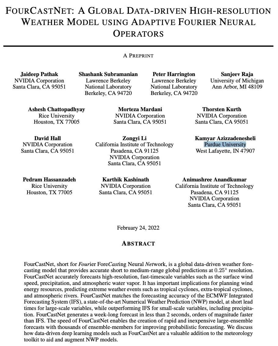 1、[LG] FourCastNet: A Global Data-driven High-resolution Weather Model using Adaptive Fourier Neural Operators