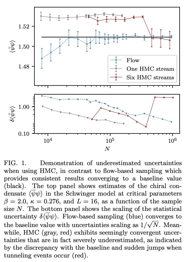 临界状态晶格Schwinger模型流采样。最近的结果表明,基于流的算法可以为晶格场理论的应用提供有效的场分布采样,如量子色动力学和Schwinger模型的研究。本文提供了在Schwinger模型中,在费米子质量的临界值下,基于流的鲁棒采样的数值演示。在相同的参数下,传统方法无法对配置空间的所有部分进行采样,导致严重低估了不确定性。