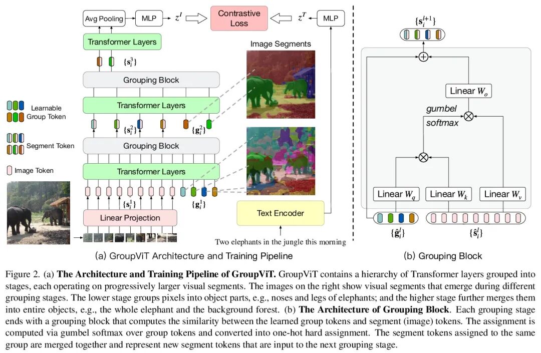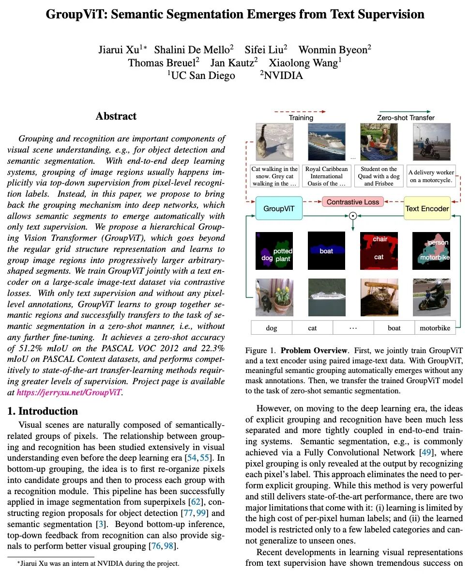 GroupViT:从文本监督涌现的语义分割。分组和识别是视觉场景理解的重要组成部分,例如,用于目标检测和语义分割。在端到端深度学习系统中,图像区域分组通常是通过像素级识别标签的自上而下的监督而隐式发生的。本文建议将分组机制带回深度网络中,使得语义分割可以在只有文本监督的情况下自动涌现。提出一种分层的分组视觉Transformer(GroupViT),超越了常规的网格结构表示,学会将图像区域分组为逐渐变大的任意形状的片段。通过对比损失,在一个大规模的图像-文本数据集上与文本编码器共同训练GroupViT。在只有文本监督和没有任何像素级标注的情况下,GroupViT学会了将语义区域组合在一起,并成功地以零样本方式迁移到语义分割任务上,不需要任何进一步的微调。GroupViT在PASCAL VOC 2012和PASCAL Context数据集上实现了51.2% mIoU和22.3% mIoU的零样本精度,其表现与需要更高水平监督的最先进的迁移学习方法相比具有竞争力。