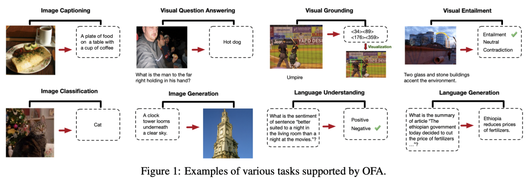 正如上图所说,OFA覆盖的下游任务横跨多模态生成、多模态理解、图片分类、自然语言理解、文本生成等多个场景,在图文描述、图像生成、视觉问答、图文推理、物体定位等多个风格各异的任务上取得SOTA。