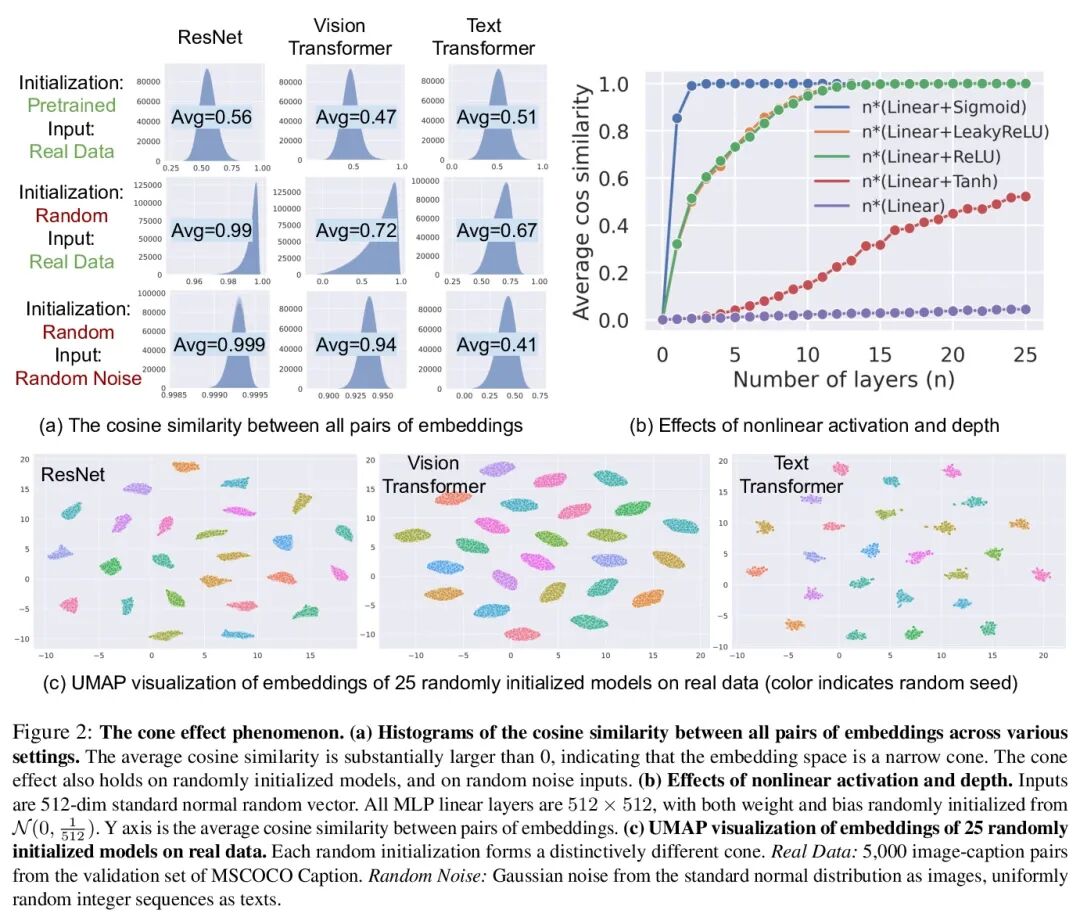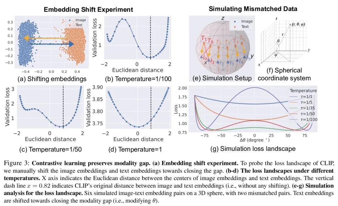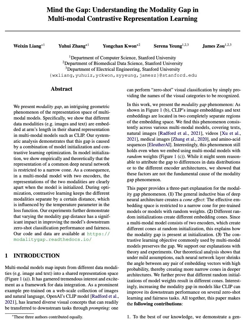 理解多模态对比表示学习中的模态间距。本文提出模态间距,多模态模型表示空间的一个有趣的几何现象。不同的数据模态(如图像和文本)在多模态模型(如CLIP)的共享表示中是以一定的距离嵌入的。系统分析表明,这种间距是由模型初始化和对比学习优化共同造成的。在模型初始化中,从经验和理论上表明,通常的深度神经网络表示被限制在一个狭窄的锥体中。因此,在一个有两个编码器的多模态模型中,当模型初始化时,两种模态的表示是明显分开的。在优化过程中,对比学习使不同模态保持一定的距离,这受到损失函数中温度参数的影响。实验结果进一步证明,改变模态间隙距离对提高模型下游零样本分类性能和公平性有很大影响。