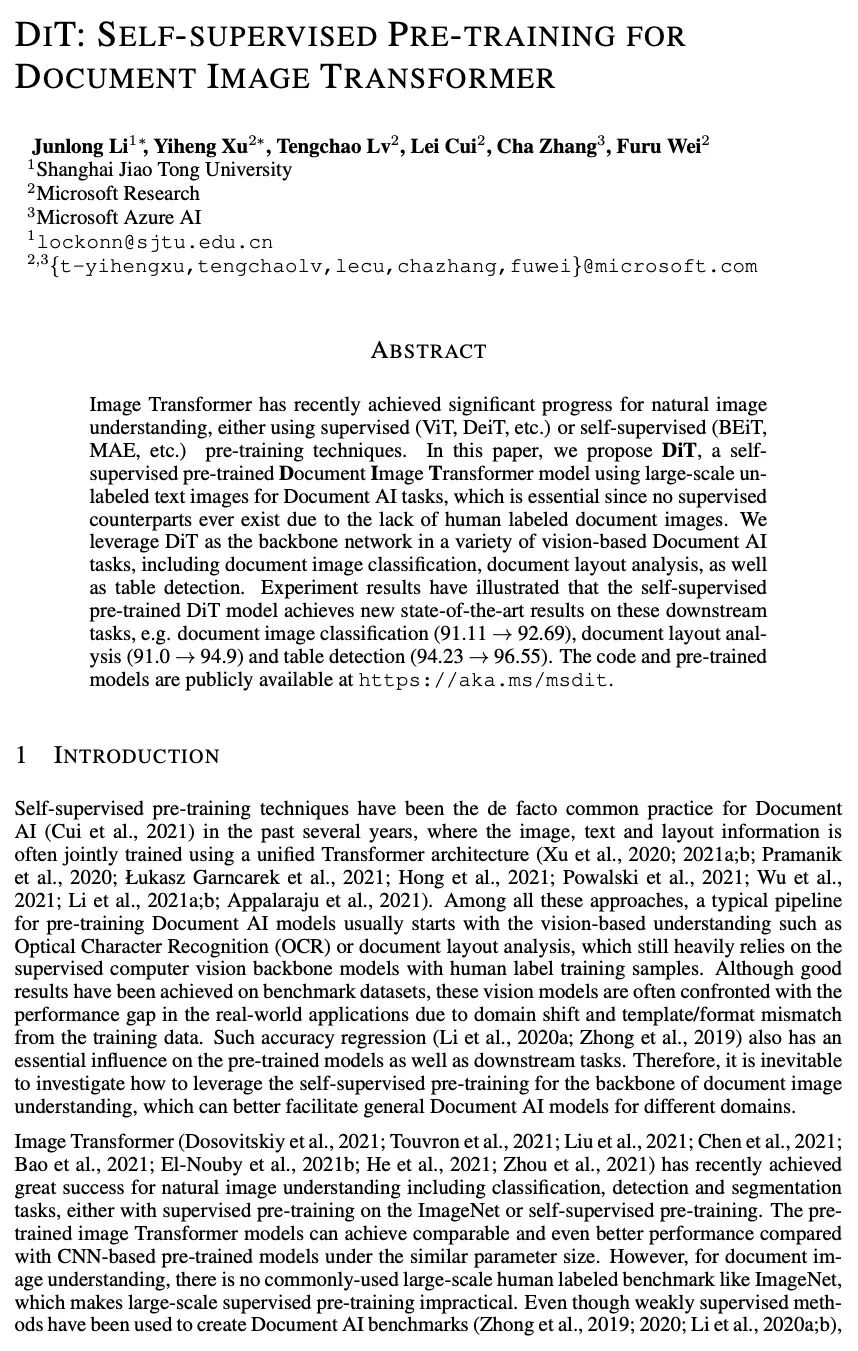4、[CV] DiT: Self-supervised Pre-training for Document Image Transformer