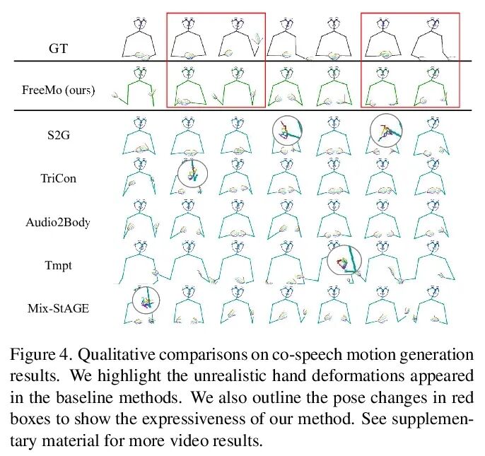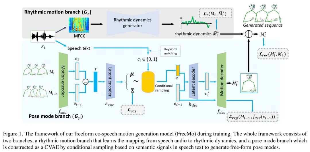 从语音生成自由肢体运动。人们在演讲时,会自然而然地做出一些自发的身体动作来加强他们的演讲。由于从语音到身体动作的非决定性映射,从语音生成身体动作本身就很困难。大多数现有的工作都是以确定的方式,通过对某些风格的调节来映射语音和动作,从而导致次优的结果。受语言学研究的启发,本文将演讲时运动分解为两个互补的部分:姿态模式和节奏动态。提出一个新的自由运动生成模型(FreeMo),采用双流结构,一个用于主要姿态生成的姿态模式分支和一个用于节奏动态合成的节奏运动分支。一方面,在语音语义的指导下,通过在潜空间中的条件化采样来生成各种姿态模式。另一方面,有节奏的动态与语音语调保持同步。广泛的实验表明,在运动多样性、质量和与语音同步方面,与几个基线相比,性能更优越。