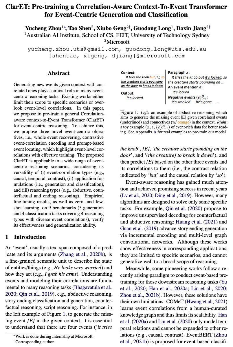 [CL] ClarET: Pre-training a Correlation-Aware Context-To-Event Transformer for Event-Centric Generation and Classification