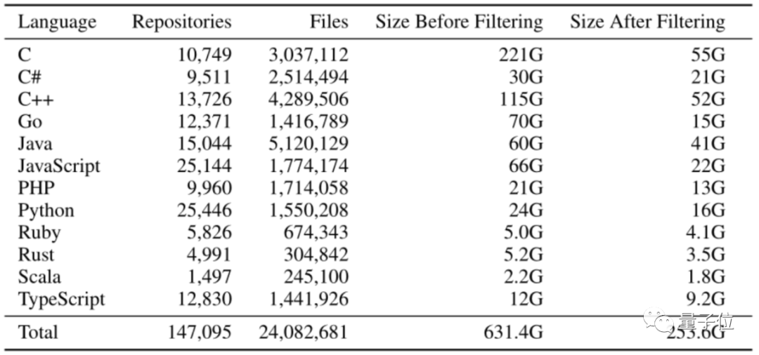 其中,C语言的代码量是最多的,达到了221GB;而Python代码的数据量比Codex和CodeParrot用得都要少。