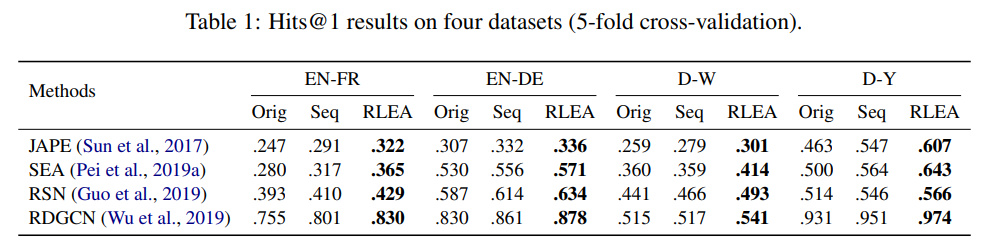 本文选取了数个性能领先且具有不同特点的实体对齐模型作为对比,并在OpenEA数据集上进行了实验。结果如下表所示:本文所述方法RLEA在全部四种数据集上均相较原有方法有明显提升。Seq为仅仅采用序列决策而不涉及强化学习的对比方法,可以看出,其仍在绝大多数情况下也优于目前所采用的贪心策略。