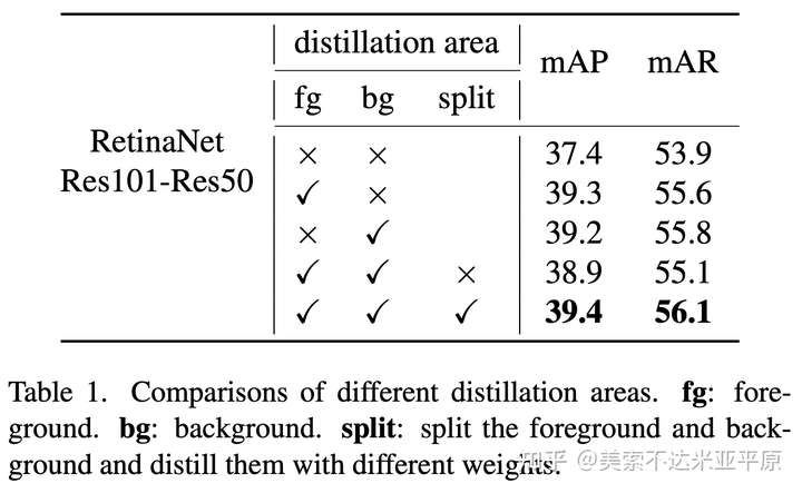 为了进一步探索前背景对于知识蒸馏的影响,我们分离出前背景进行了蒸馏实验,全图一起蒸馏会导致蒸馏性能的下降,将前景与背景分开学生能够获得更好的表现。