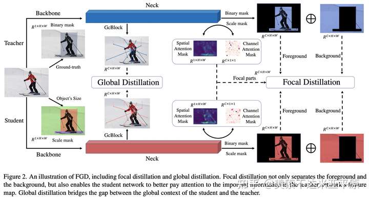针对学生与教师注意力的差异,前景与背景的差异,我们提出了重点蒸馏Focal Distillation:分离前背景,并利用教师的空间与通道注意力作为权重,指导学生进行知识蒸馏,计算重点蒸馏损失。