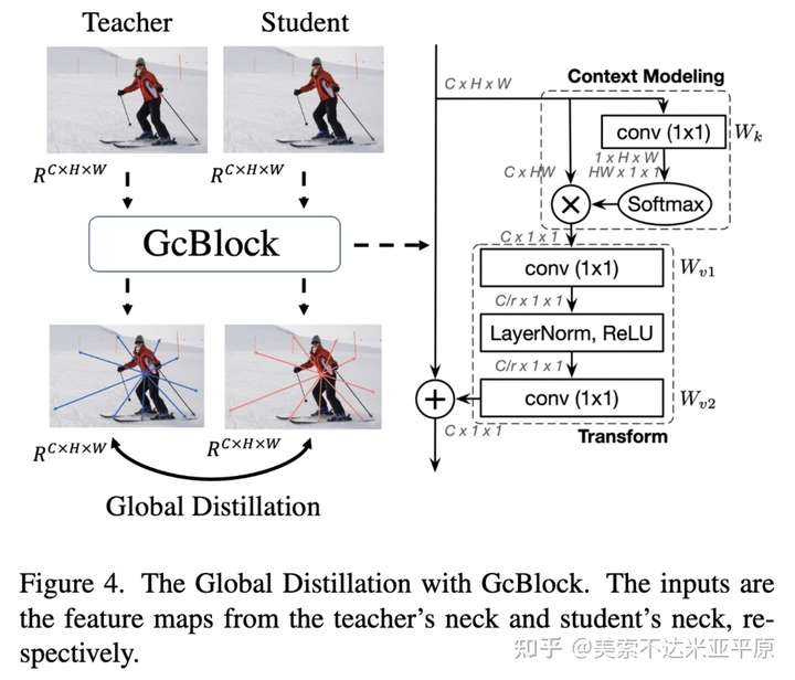 如前所述,Focal Distillation将前景与背景分开进行蒸馏,割断了前背景的联系,缺乏了特征的全局信息的蒸馏。为此,我们提出了全局蒸馏Global Distillation:利用GcBlock分别提取学生与教师的全局信息,并进行全局蒸馏损失的计算。