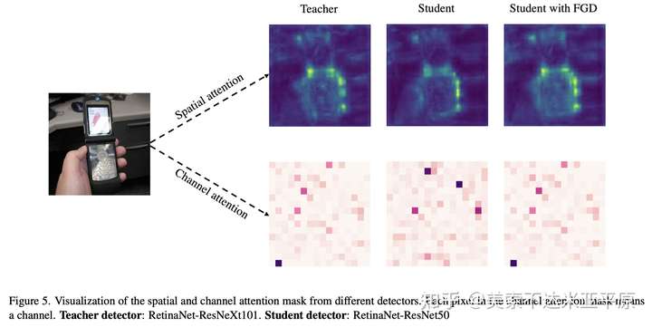 对于使用FGD蒸馏完成后的学生模型,我们再次进行了注意力的可视化。可以看到,经过FGD训练后的学生,空间注意力和通道注意力的分布与教师都非常相似,这表明学生通过蒸馏学到了教师的知识并获得了更好的特征,由此实现了性能的提升。