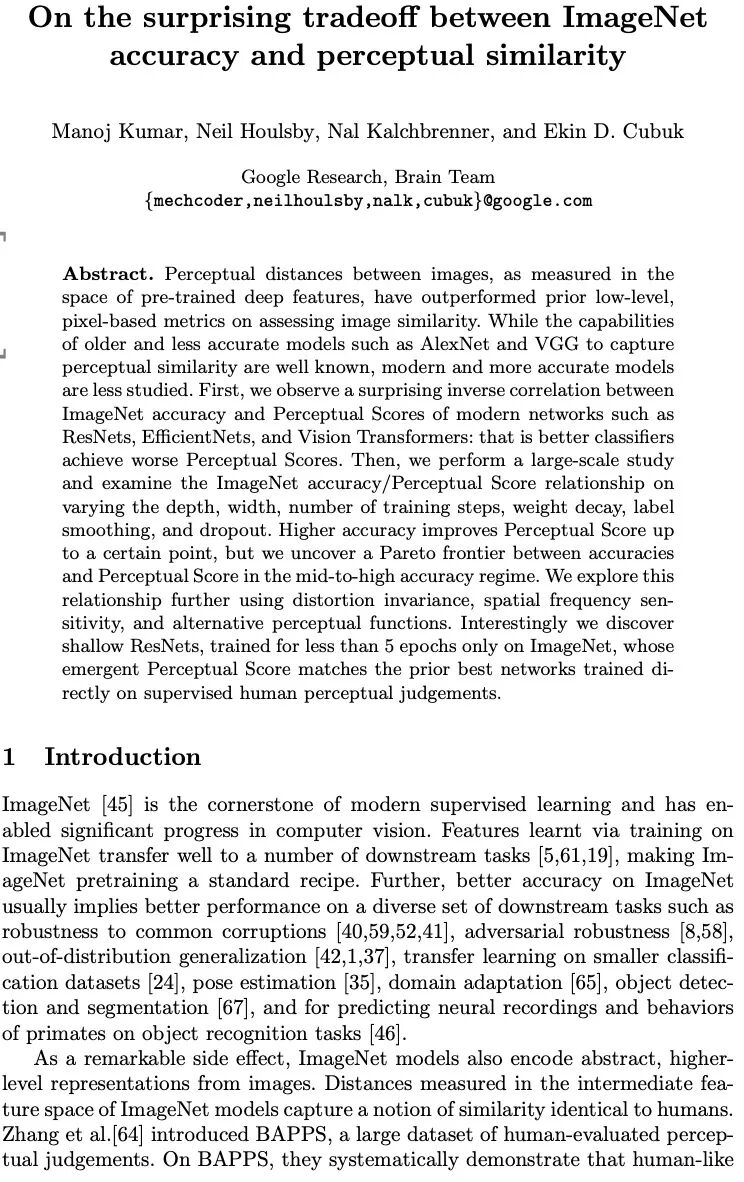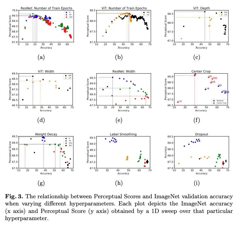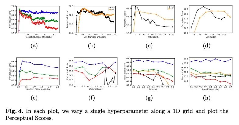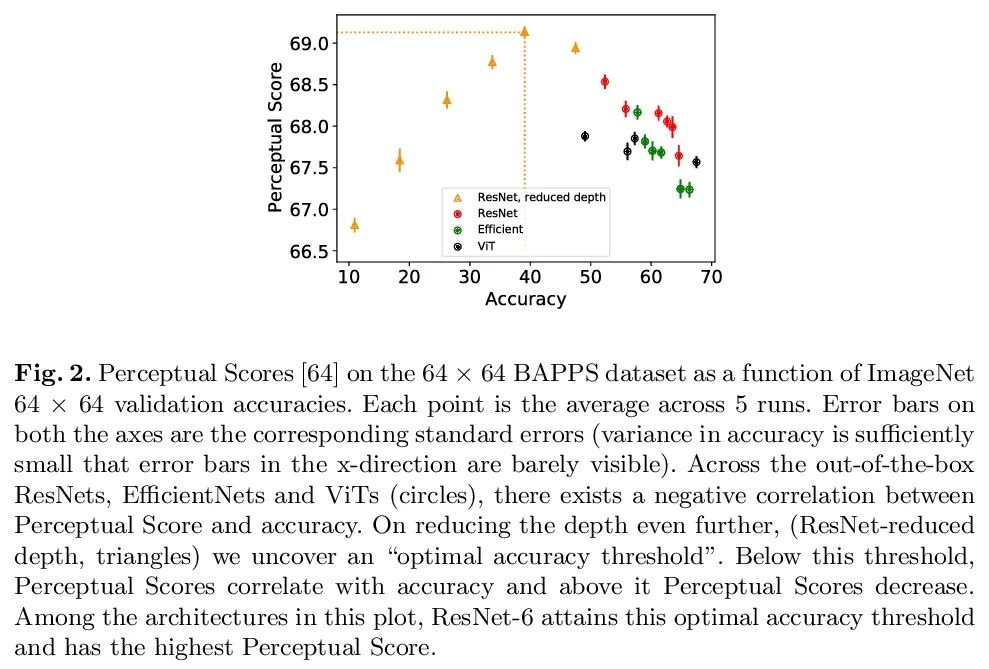 ImageNet上精度和感知相似度间意外的反相关关系。在预训练深度特征空间中测量的图像间的感知距离,在评估图像相似度方面已经超过了先前的低层的、基于像素的衡量标准。虽然旧的和不太准确的模型,如AlexNet和VGG捕捉感知相似性的能力是众所周知的,但现代的和更准确的模型却没有被研究。本文观察到现代网络如ResNets、EfficientNets和Vision Transformers在ImageNet上的精度和感知得分间存在惊人的反相关关系:即更好的分类器获得的感知得分更差。本文进行了一项大规模研究,考察了ImageNet的精度/感知分数在不同的深度、宽度、训练步数、权重衰退、标签平滑和dropout等方面的关系。更高的精度在一定程度上提高了感知分数,但在中高精度的情况下,精度和感知分数之间存在一个帕累托前沿。用失真不变性、空间频率敏感性和其他感知函数进一步探索这种关系,发现浅层ResNets,只在ImageNet上训练了不到5轮,其出现的Perceptual Score与之前直接在有监督人类知觉判断上训练的最佳网络相匹配。