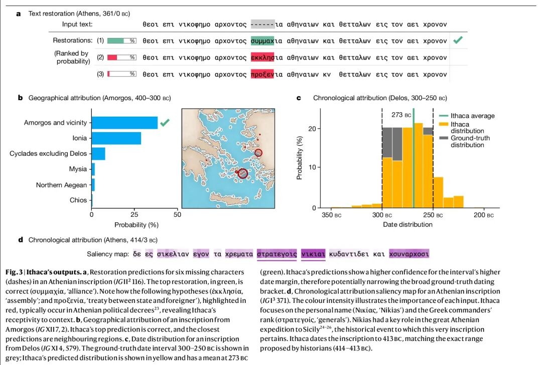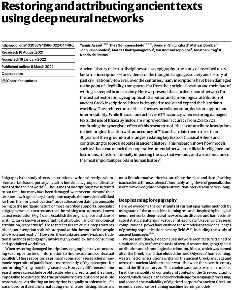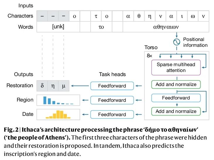 基于深度网络的古文字恢复与(地域)归属。古代历史依赖于诸如书画等学科——研究被称为铭文的雕刻文字,以证明过去文明的思想、语言、社会和历史。然而,几个世纪以来,许多铭文已经被损坏到无法辨认的地步,被运到远离原址的地方,其书写日期也充满了不确定性。本文提出Ithaca,一种用于古希腊铭文的文本修复、地理归属和时间归属的深度神经网络,可以改变铭文作为历史来源的价值,并帮助历史学家对整个古代世界书信习惯的分布和性质有一个更全面的了解。Ithaca旨在协助和扩展历史学家的工作流。Ithaca的架构着重于协同、决策支持和可解释性。虽然Ithaca在修复受损文本时能达到62%的精度,但历史学家使用Ithaca后,其精度从25%提高到72%,证实了这一研究工具的协同效应。Ithaca可以将铭文归于其原始地址,精度为71%,并且可以将其日期确定在其真值30年范围内,重新确定了古雅典关键文本,为古代历史的热点争论做出了贡献。本文工作表明,像Ithaca这样的模型可以释放出人工智能和历史学家之间的合作潜力,对研究和撰写人类历史上最重要的时期之一的方式产生变革性影响。