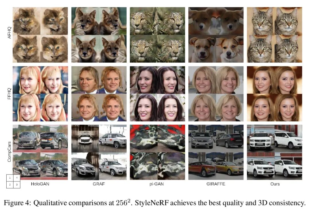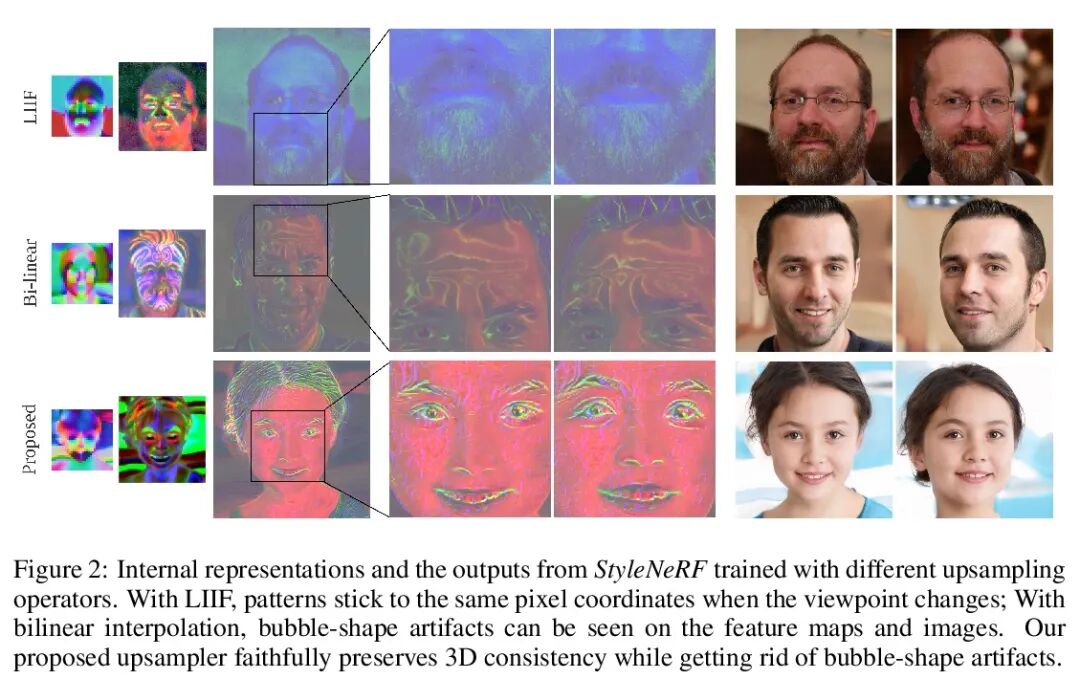 StyleNeRF:面向高分辨率图像合成的基于风格的3D感知生成器。本文提出StyleNeRF,一种用于具有多视图高度一致性的照片级逼真高分辨率图像合成的3D感知生成模型,可以在非结构化的2D图像上进行训练。现有方法要么不能合成具有精细细节的高分辨率图像,要么产生明显的3D不一致的结果。此外,其中很多还缺乏对风格属性和明确3D摄像机位置的控制。StyleNeRF将神经辐射场(NeRF)整合到一个基于风格的生成器中,以解决上述挑战,即提高高分辨率图像生成的渲染效率和3D一致性。只进行体渲染以产生低分辨率的特征图,并在二维中逐步应用升采样来解决第一个问题。为缓解2D升采样造成的不一致,提出了多种设计,包括更好的升采样器和新的正则化损失。通过这些设计,StyleNeRF能够以交互式速率合成高分辨率图像,同时高质量保留3D一致性。StyleNeRF还能控制摄像机的姿态和不同级别的样式,可通用于未见过的视图。还支持挑战性的任务,包括放大和缩小、风格混合、逆转和语义编辑。