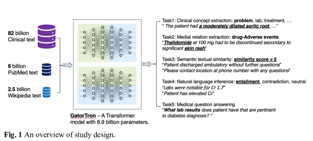 GatorTron:从非结构化电子病例中解锁病人信息的大规模临床语言模型。人们对开发自然语言处理(NLP)中的大规模深度学习模型越来越感兴趣,该模型是从非结构化电子病例(EHR)中提取病人信息的关键技术。然而,在临床领域探索大型语言模型的研究有限;目前最大的临床NLP模型是用1.1亿个参数训练的(相比之下,一般领域的参数为1750亿)。目前还不清楚大尺寸的NLP模型如何帮助机器从非结构化的EHR中理解病人的临床信息。本文用超过900亿词的文本开发了一个大型临床Transformer模型GatorTron,在5个临床NLP任务上进行了评估,包括临床概念提取、关系提取、语义文本相似性、自然语言推理和医学问答。GatorTron现在是临床领域最大的Transformer模型,从之前的1.1亿参数扩展到89亿参数,并在针对EHR中记录的各种医疗信息的5项临床NLP任务中取得了最先进的性能。GatorTron模型在理解和利用临床表述中的病人信息方面表现更好,可以应用于改善医疗服务和病人结果。