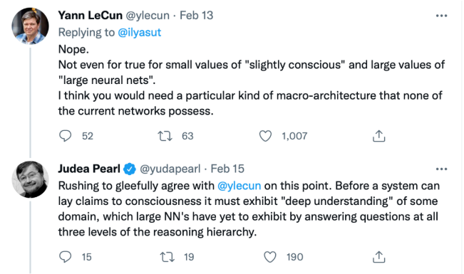 他的观点立即引起了一众 AI 大咖的讨论。针对 IIya Sutskever 的见解,图灵奖得主、Meta AI 首席科学家 Yann LeCun 首先就抛出了反对意见,给出一个直截了当的观点:「Nope.」(不。)Judea Pearl 也力挺 Lecun,表示现有的深度神经网络还无法「深度理解」某些领域。