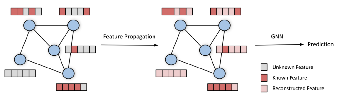 在与 Maria Gorinova、Ben Chamberlain (Twitter)、Henry Kenlay 和 Xiaowen Dong (Oxford) 合着的一篇新论文 [4] 中,作者提出了特征传播 (FP)算法 [4], FP是一种简单但高效且令人惊讶的有效解决方案问题。简而言之,FP 通过在图上传播已知特征来重构缺失的特征。然后可以将重建的特征输入任何 GNN 以解决下游任务,例如节点分类或链接预测。