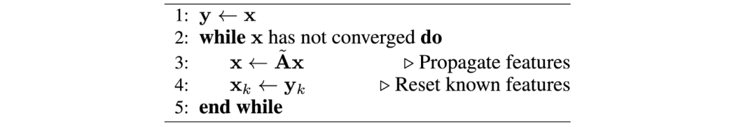 传播步骤非常简单:首先,未知特征用任意值初始化[5]。通过应用(归一化的)邻接矩阵来传播特征,然后将已知特征重置为其真实值。重复这两个操作,直到特征向量收敛[6]。