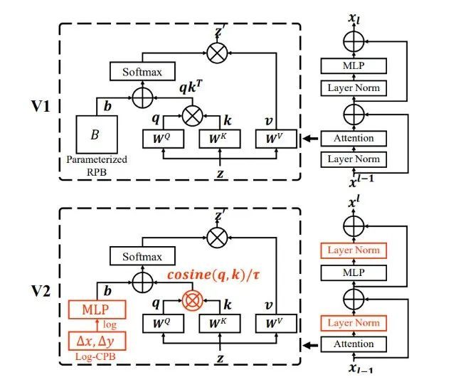 仔细观察原始 Swin Transformer 的架构,研究员们发现这是由于残差分支的输出直接加回主分支而导致的。原始的 Swin Transformer(以及绝大多数视觉 Transformer)在每个残差分支的开始都使用了预归一化(pre-normalization),它可以归一化输入的幅值,但对输出没有限制。在预归一化下,每个残差分支的输出激活值会直接合并回主分支,并被逐层累加,因而主分支的幅值会随着深度的增加而越来越大。这种不同层的幅值差异很大程度上导致了训练的不稳定性。