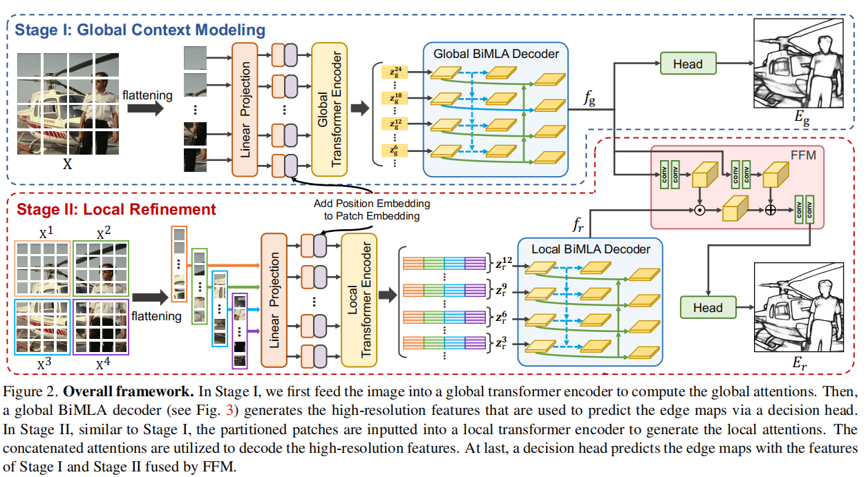 卷积神经网络通过逐步探索上下文和语义特征在边缘检测方面取得了重大进展。然而,随着感受野的扩大,局部细节逐渐被抑制。最近,视觉Transformer在捕获远程依赖方面表现出出色的能力。受此启发,我们提出了一种新颖的基于Transformer的边缘检测器,边缘检测Transformer(EDTER),通过同时利用完整的图像上下文信息和详细的局部线索来提取清晰明快的对象边界和有意义的边缘。EDTER 分两个阶段工作。在第一阶段,全局Transformer编码器用于在粗粒度图像块上捕获远程全局上下文。然后在第二阶段,局部Transformer编码器在细粒度补丁上工作以挖掘短程本地线索。每个Transformer编码器后面都有一个精心设计的双向多级聚合解码器,以实现高分辨率特征。最后,全局上下文和局部线索由特征融合模块组合并输入决策头进行边缘预测。在 BSDS500、NYUDv2 和 Multicue 上进行的大量实验证明了 EDTER 与最先进技术相比的优越性。