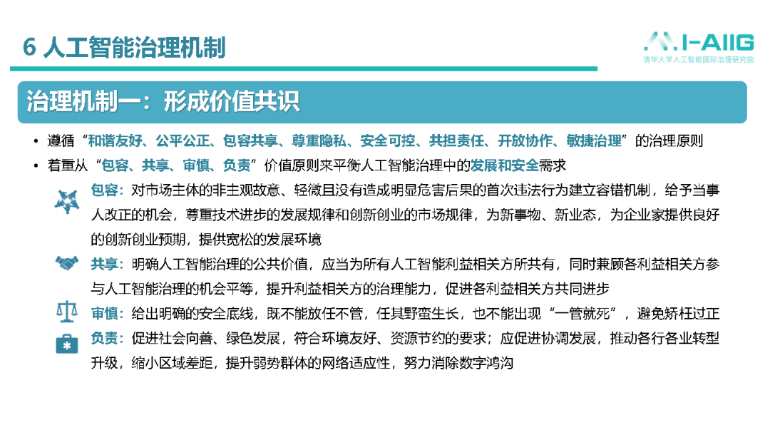 从人工智能治理机制来讲,首先需要做的就是形成基本价值共识。从目前全球范围内发布的各种准则来讲,大家如果看一下,国家新一代人工智能治理专业委员会和G20共识,包括联合国的,其实内容上都比较一致。虽然各具特色,但是,最核心的内容,还是怎么样从包容、共享、审慎、负责的价值原则对人工智能发展提供相关引导。