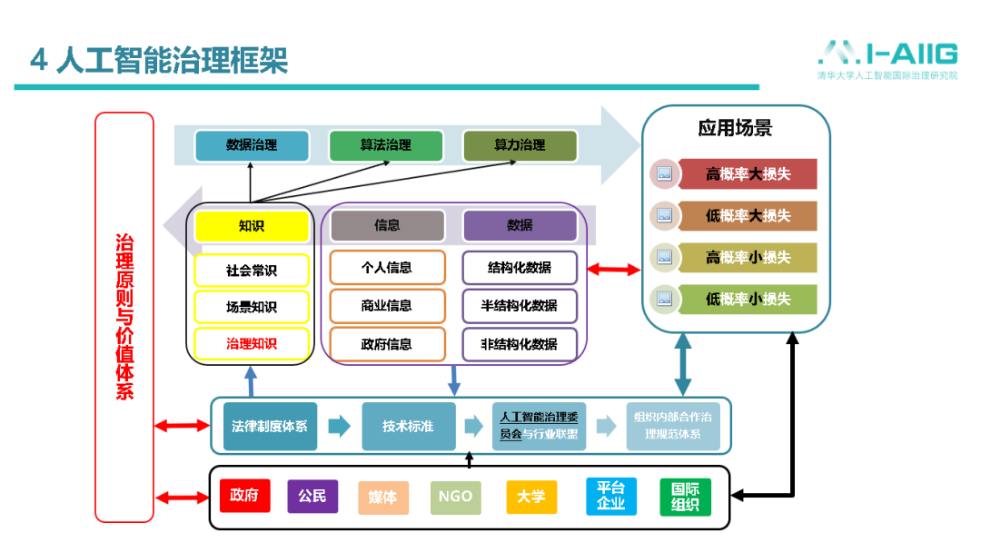如上图所示,这是我们人工智能国际治理研究院提出的人工智能治理的基本框架。首先,治理基本原则和价值体系,也就是大家在共同提倡的原则或准则。在这方面,各国的很多基本准则有高度的相似性。那么,我们又怎样能够把需要治理的问题、主体、对象、机制等融合在一个框架下呢?从“数据、信息、知识、算力”,数据治理、算法治理、算力治理,都可能是我们要关注的治理对象。这其中还涉及到一个从知识、信息到数据的治理过程和从数据到知识的学习过程。如果从治理主体来讲,首先有政府,政府代表公权力,对技术和技术行为进行治理,存在必要性和合法性。另外,有社会各方面主体的参与,个人或者社会组织、媒体、高校、平台、国际组织等等,这些都是治理主体层面的考虑。治理工具方面,其实就是通过法律制度体系、技术标准、行业准则、规范体系,这是我们的各种治理工具。我们是通过主体,运用工具,对上面这些问题进行治理。这里面有一个特殊的地方,就是数据、算法、算力,最终的落脚点是应用场景,在场景中,人类和人工智能进行交互。从治理角度来讲,通常希望降低技术风险,使社会效益最大。因此,我们有各种不同类型的场景,从技术的治理风险角度来讲,有的是大概率、大损失的,我们要高度关注的。还有一些是小概率、大损失,所谓“黑天鹅事件”,我们也要高度关注。另外,还有很多小损失的,相对来讲不用太多担心,保持持续关注就好。我们把这些治理元素纳入其中,一方面是从技术角度,另外是应用角度,形成了现在的这个基本框架。下面我就逐一介绍下人工智能治理体系中的各个元素。