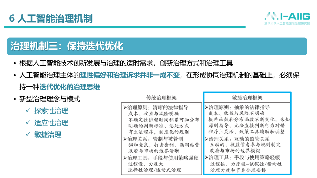 第三个治理机制是怎样保持迭代优化,这点也是我们在人工智能治理方面,特别强调,也是特别独特的地方。原来,传统技术治理领域,技术应用往往需要经过几十年的扩散过程,在社会上只能达到70%、80%的渗透率。但是,人工智能技术的创新发展和应用扩散都非常快,在短短的几个月,甚至几天,一下子就能拓展到成百上千万的用户,技术发展非常快。这样的话,很多治理规则,相对来讲,就很难像传统治理方式,经过多方审慎的研讨,达成共识再出台,这时候技术早都已经“飞”到规则前面去了,技术发展和治理规则之间存在一个时间差。面对这种情况,我们要保持各种治理机制和治理模式相结合。首先是探索性治理,或者,另外一个说法就是前瞻性治理,先预想到潜在的风险,怎么样有效的避免不利的情况发生。其次是适应性治理或者敏捷治理,我们要小步快跑式的尽快跟上,但也不要追求“完美主义”,很多治理规则,一旦追求完美主义,就跟不上了,要有效的平衡治理效果和治理节奏。