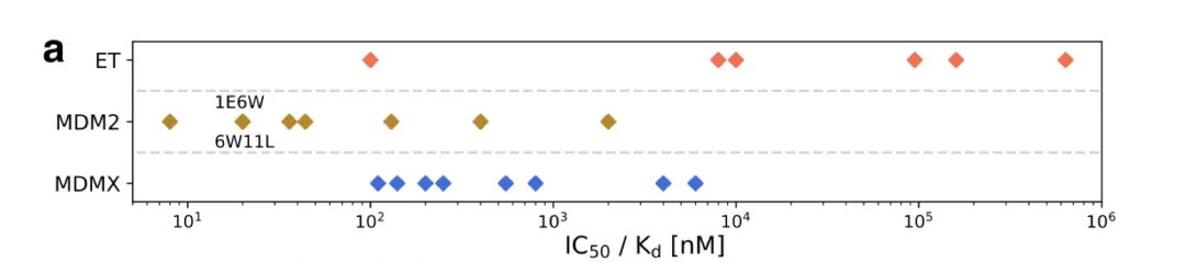 作者在之前的研究基础上,选择了ET domain和MDM2/MDMX-p53两个靶点作为研究对象,因为这个体系有跨度足够大的不同多肽序列以及晶体的结构。