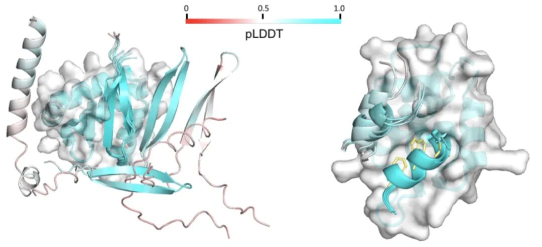 作者通过拼接多段多肽来实现结合竞争的模拟思路较为新颖,并且也成功地识别出了结合最强的多肽序列。此意义对于线性螺旋肽的设计意义非常重大。因为在实际的药物设计过程中,我们只关心那些结合性质最好序列!并且AF2的预测时间较短,完全可以配合Rosetta等进行大量的多肽序列生成和设计。